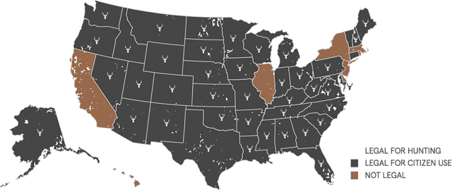 Silencers are legal according to federal law, but they are also regulated at the state level. The image below, courtesy of SilencerCo, shows which states allow suppressors, and which don’t. As you can see, silencers are legal in most states.